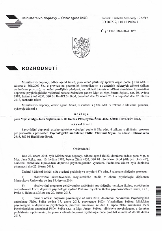 Jmenuji se Jan Sojka a jsem akreditovaný dopravní psycholog schválený Ministerstvem dopravy ČR.